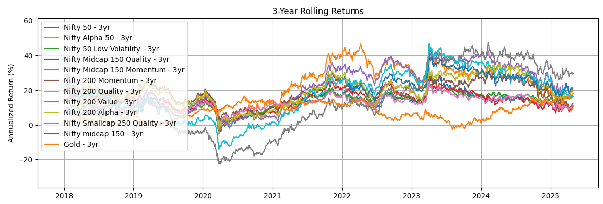 - Rolling Returns: Overlapping returns calculated over 1-year, 3-year and 5-year periods.