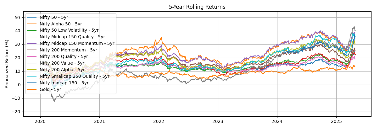 | Nifty 50 | Alpha 50 | Low Vol | MC150 Qual | MC150 Mom | 200 Mom | 200 Qual | 200 Val | 200 Alpha | SC250 Qual | MC 150 | Gold | |